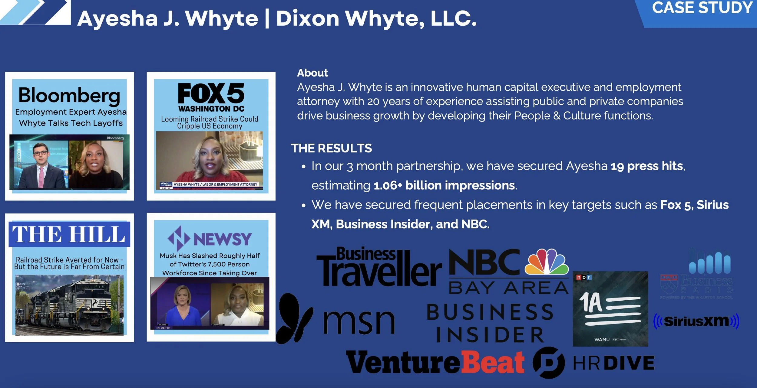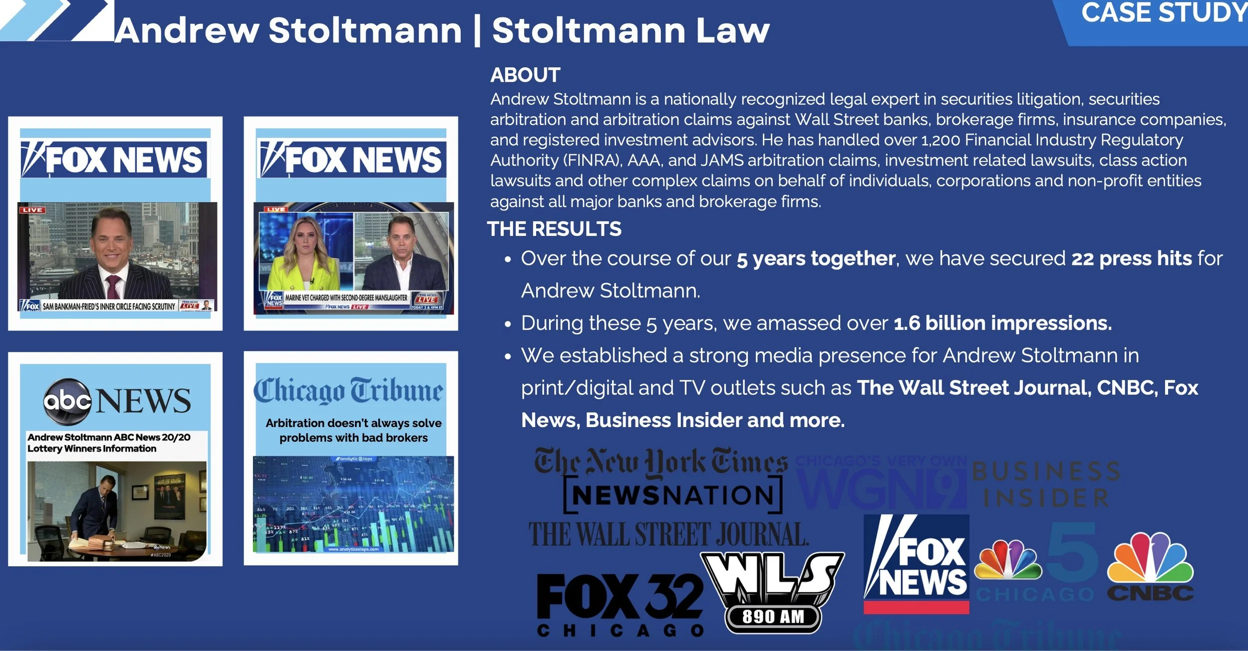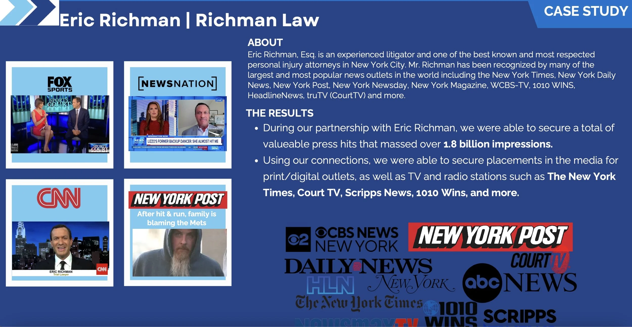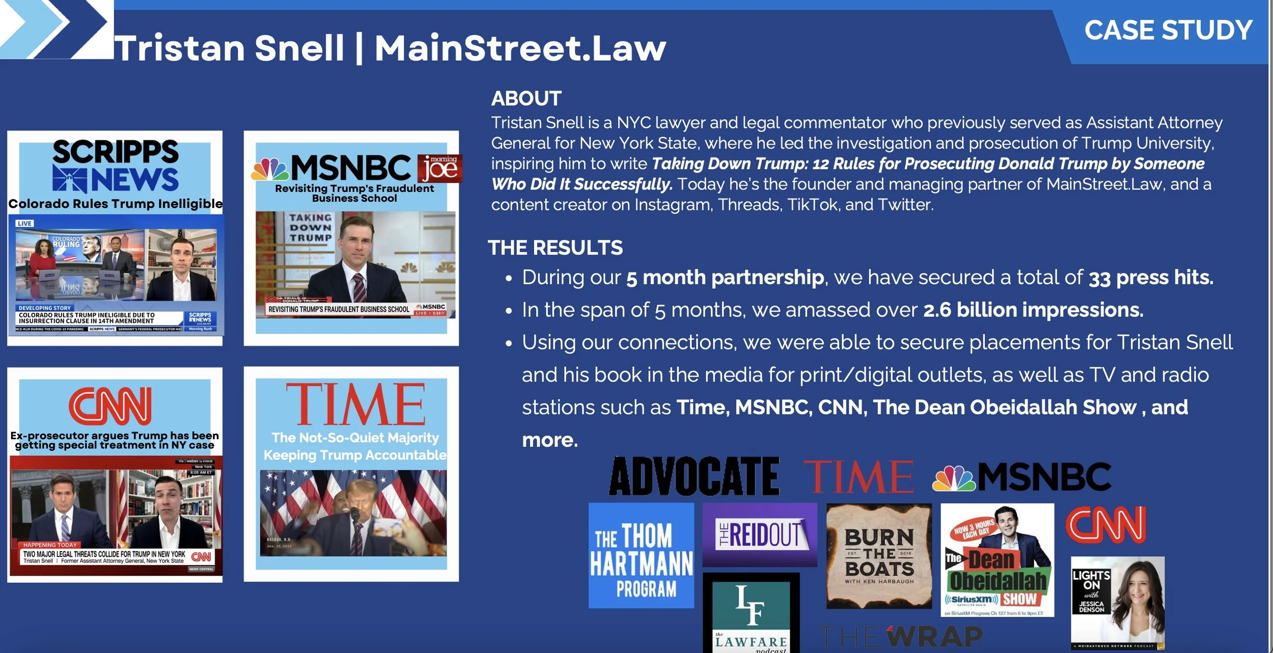Case Studies: I recorded the number of impressions and press hits our clients had gained since working with the company.