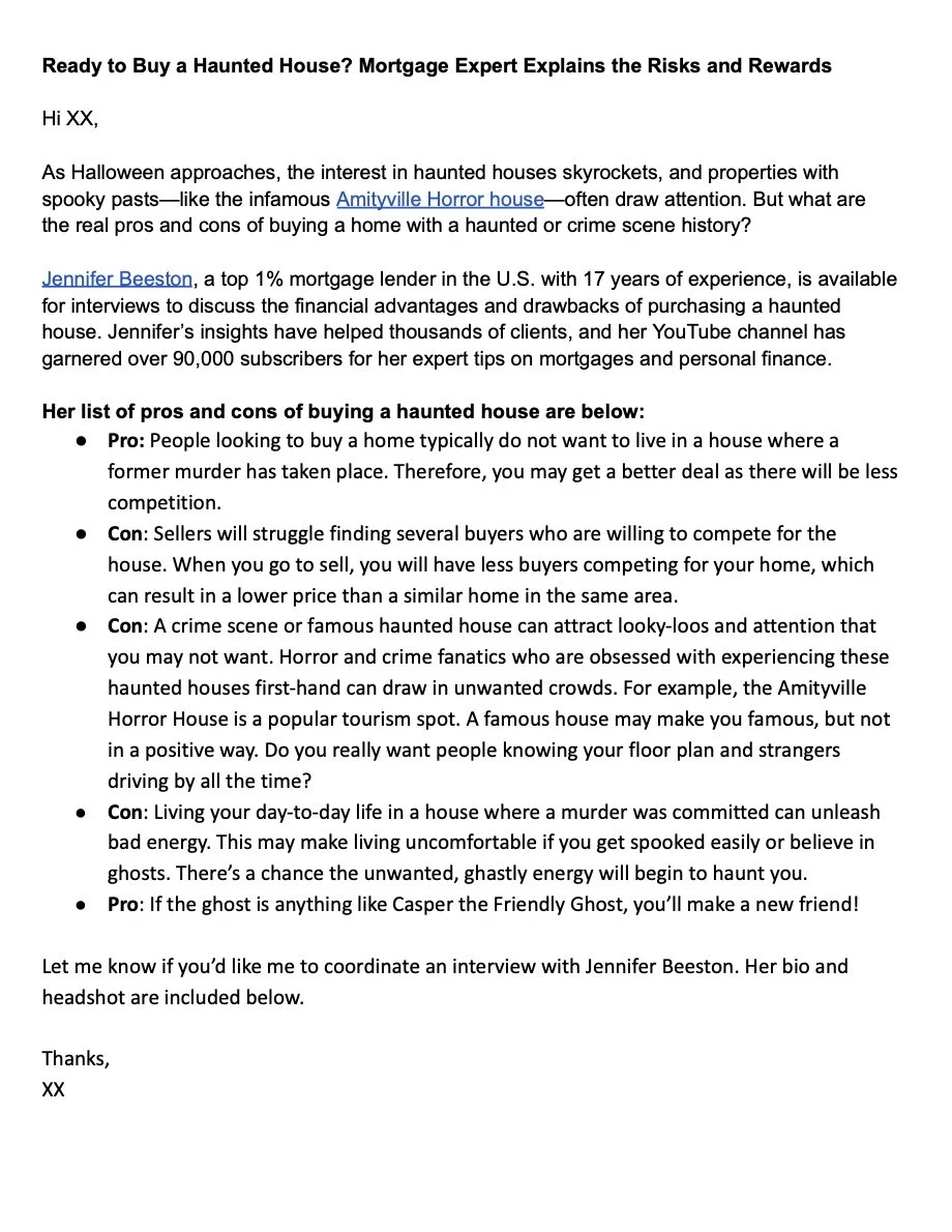 This pitch was crafted for Pace PR’s mortgage expert client, Jennifer Beeston. I wrote this pitch in October, offering Beeston as an expert for real estate stories or articles related to Halloween.